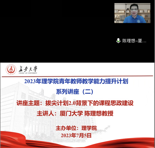 应5123导航通五湖邀请,2023年7月5日晚上19:00,厦门大学陈理想教授通过腾讯会议为我院师生作了题为“拔尖计划2.0背景下的课程思政建设”的报告。报告会由副院长商泽进主持,5123导航通五湖及其他学院90余名教师参加了此次报告会。